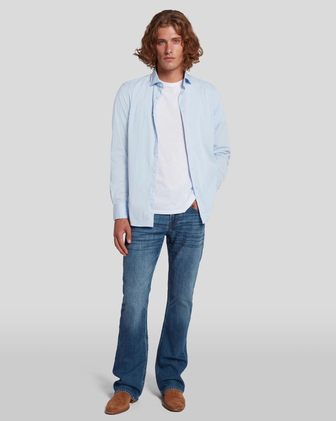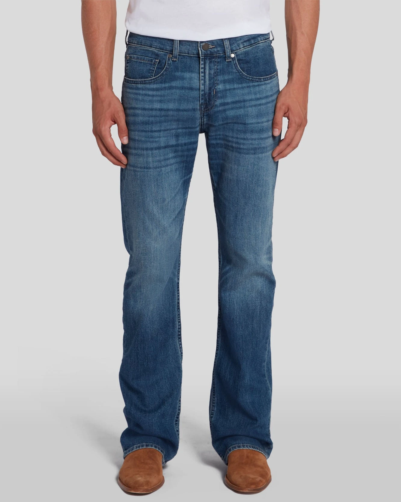 A contemporary bootcut silhouette that’s perfectly relaxed without feeling oversized. We crafted this pair with our Japanese stretch denim, which offers a soft feel and flexible stretch. This dark blue wash features heavy whiskering and sanding for that lived-in look, while our iconic 7 squiggle embroidery on the back pocket adds our signature touch.