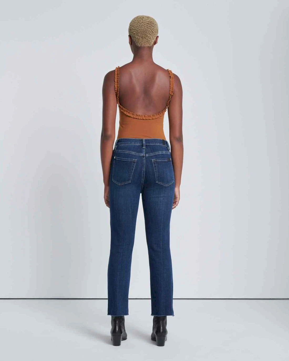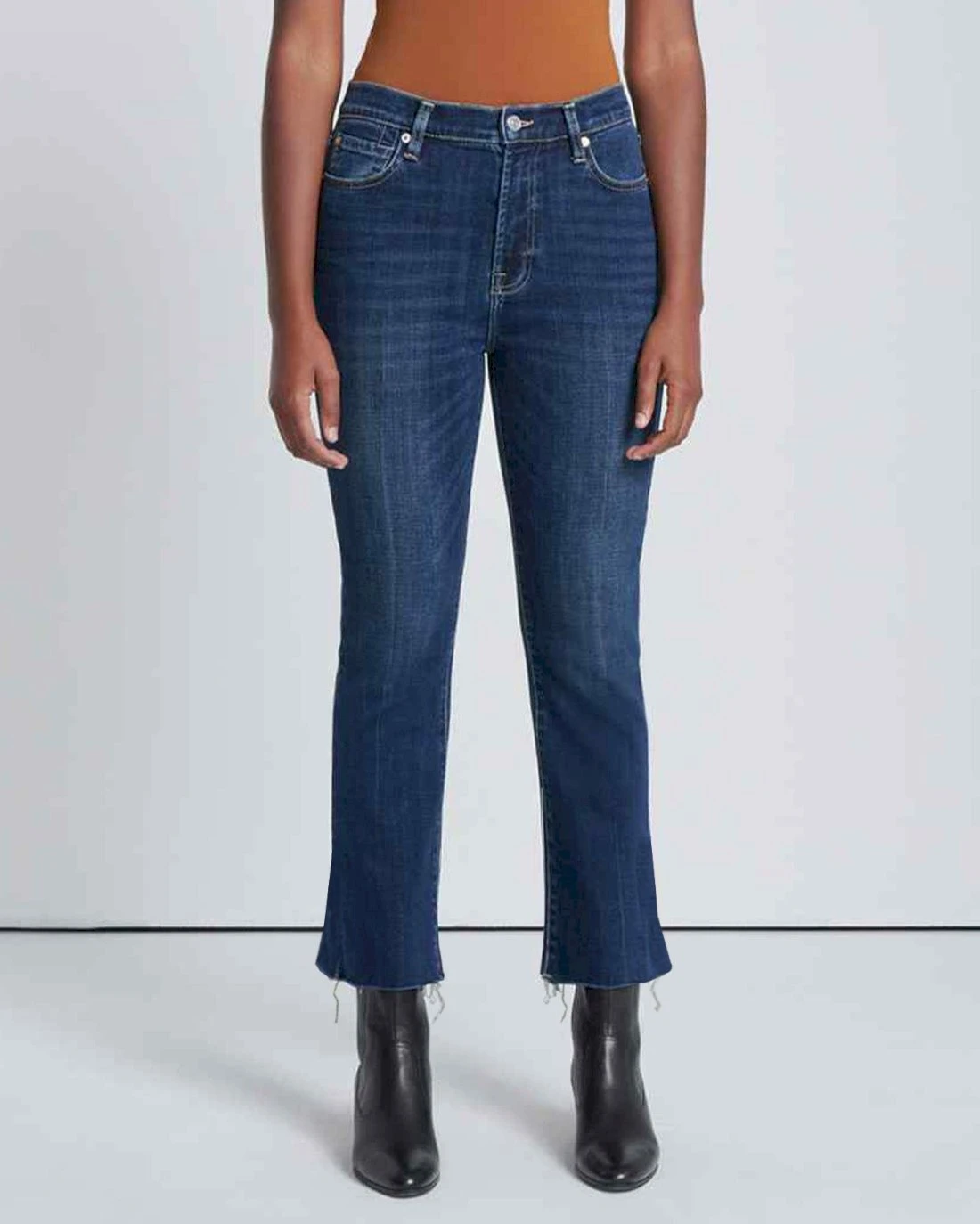 Done in a dark wash with whiskering, this high-waisted style has an excellent crop. Cut from our soft broken twill, a medium stretch denim for all-day comfort. Its slim kick leg boasts a slight flare with a raw hem for a vintage-inspired look made modern.