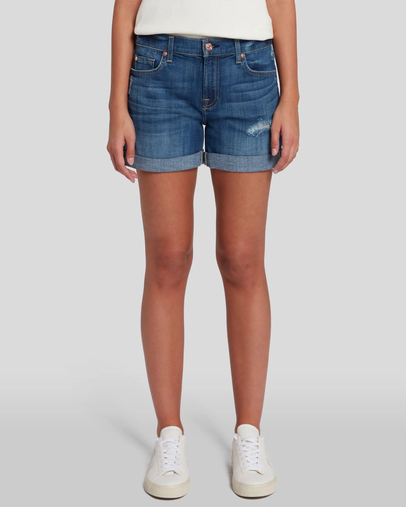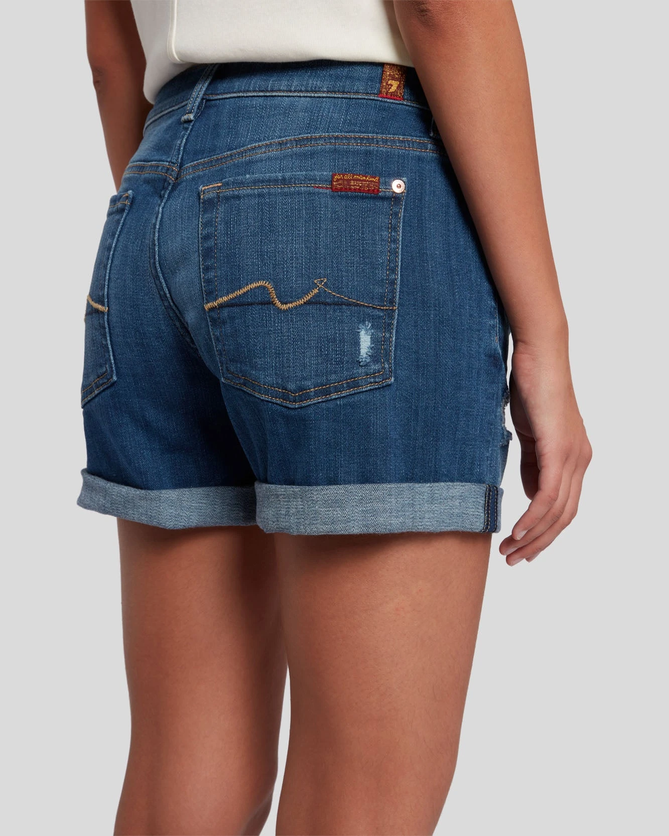 A classic denim short with a mid rise and a relaxed fit. Crafted from our signature premium denim with stretch in an indigo wash with whiskering and destroyed details, this pair of women’s denim shorts will be the most comfortable thing you wear. Cuffed hem lends a clean finish. Pair with a tee for a quintessentially casual look.