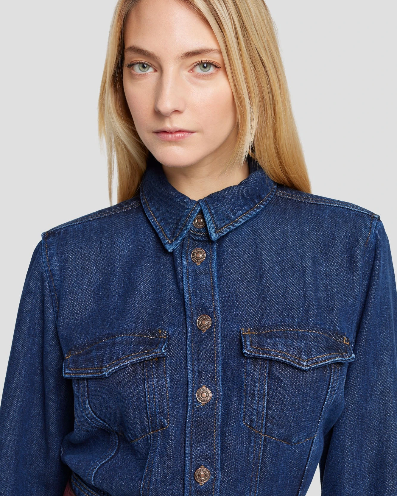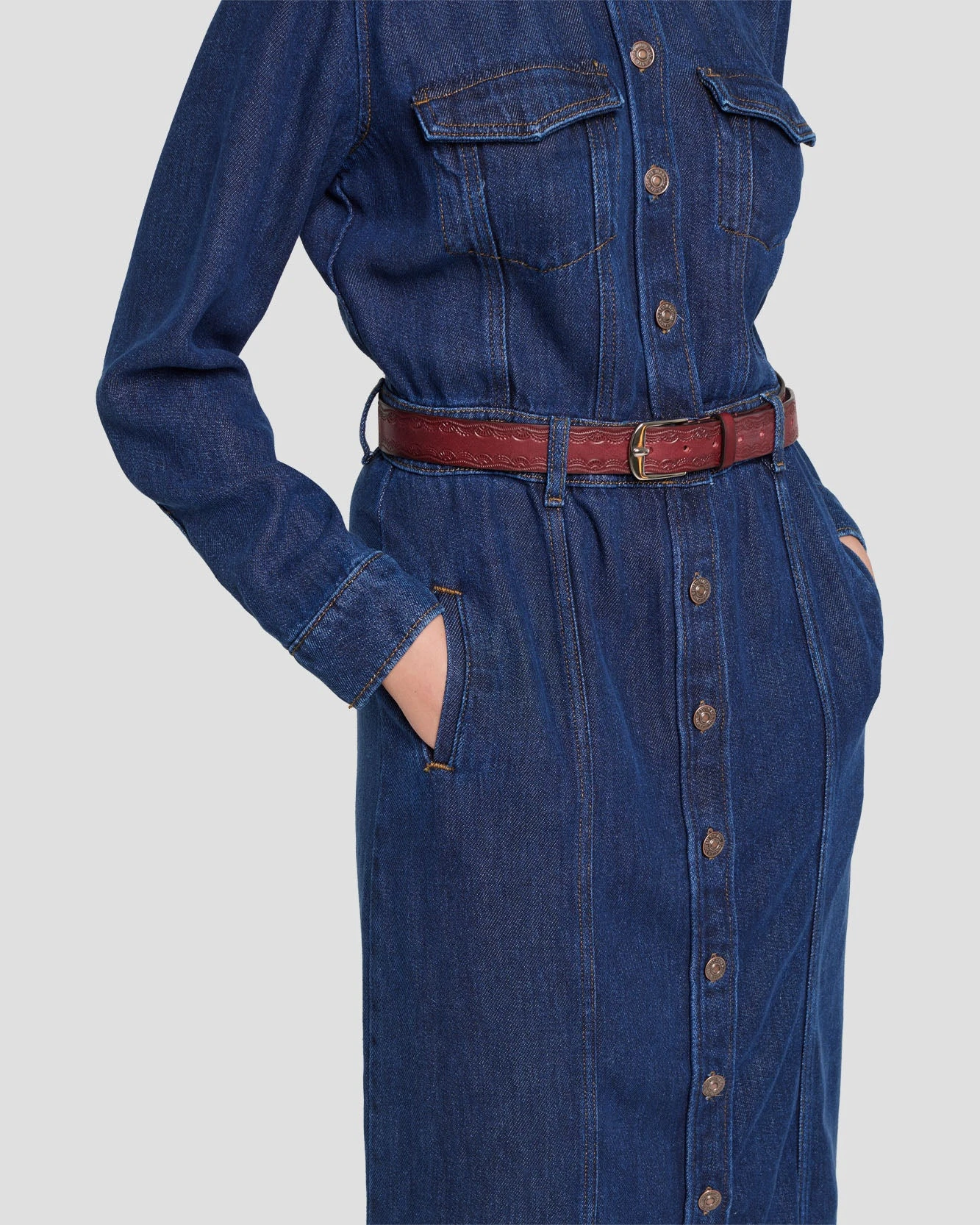 Soft as silk, light as air. Crafted from 100% lyocell, our Denim Lustre line has a super-soft hand feel and is made with the environment in mind. This Luxe Dress falls mid-calf and features a cinched waist and a shank button cuff. Wear this women’s denim dress slightly unbuttoned at the hem for an adjustable front slit, or pair it with your favorite pair of 7s for full denim dressing.