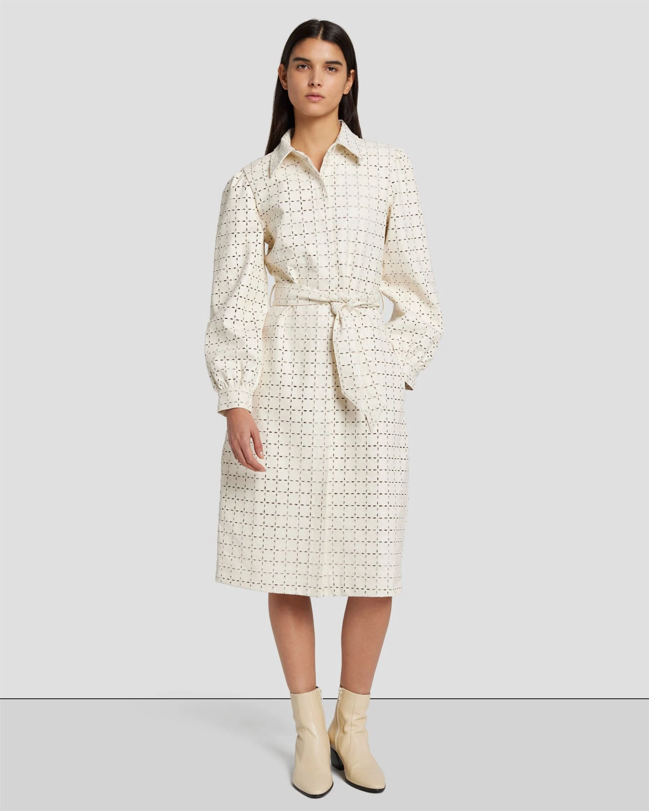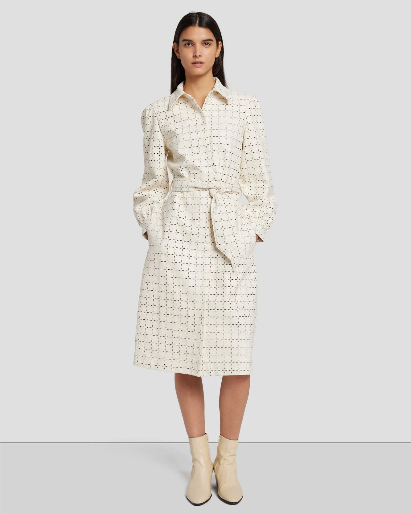 It’s all in the details. This self-tie midi shirt dress is crafted from faux leather and features eyelet detailing and cuffed button sleeves. Wear it as a dress or style it open over denim as a lightweight coat.
