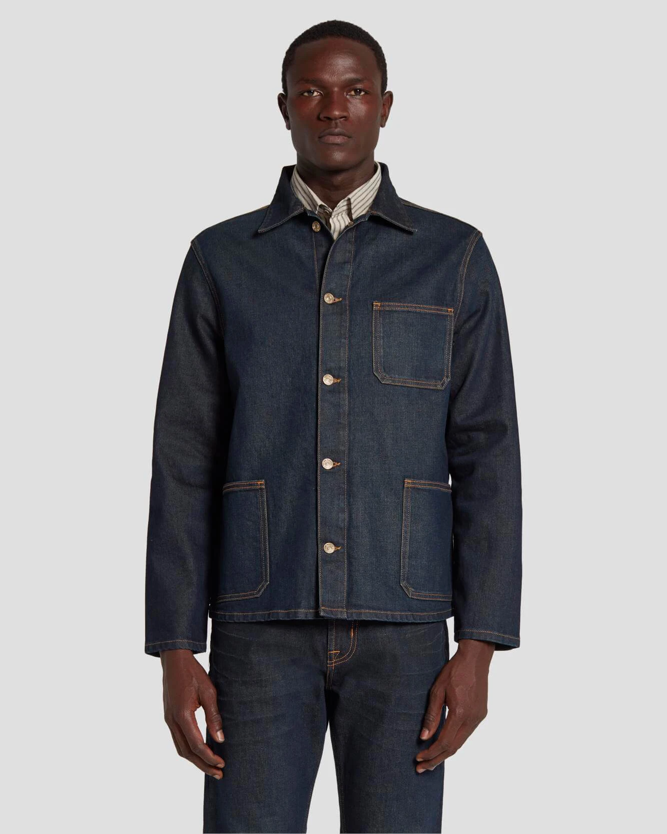 Cut from Japanese denim in an authentic blue rinse, this piece is accented with unique leather labelling for an elevated feel. This 3-pocket jacket looks great over a turtleneck, tee or button-down.