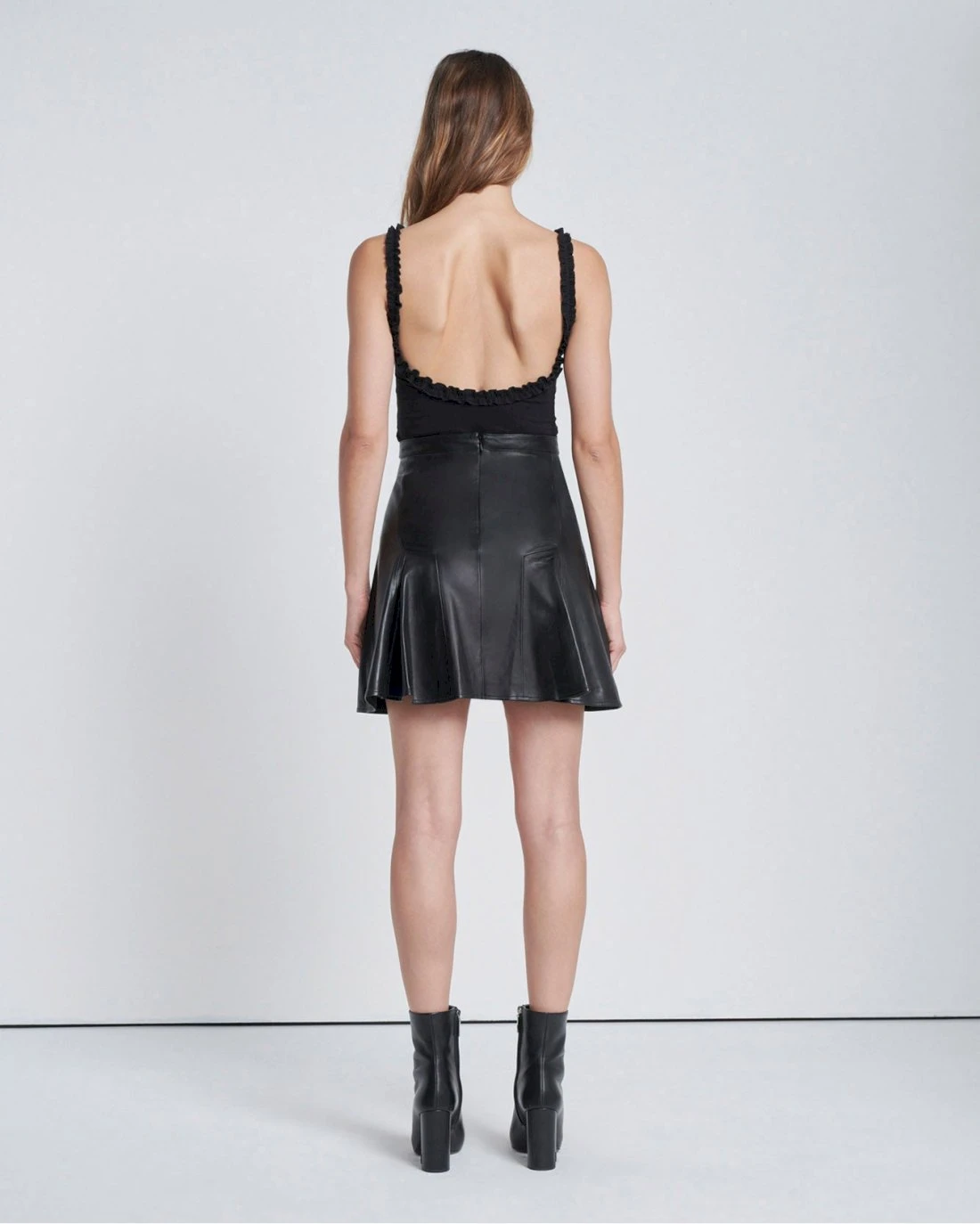 Plan your fall capsule wardrobe around this chic mini skirt crafted in buttery soft leather. Fitted from waist to hip and finished with a playful, pleat flounce hem. Style for edge with a tee and denim jacket or pair back to the Cropped Leather Jacket for sleek sophistication.