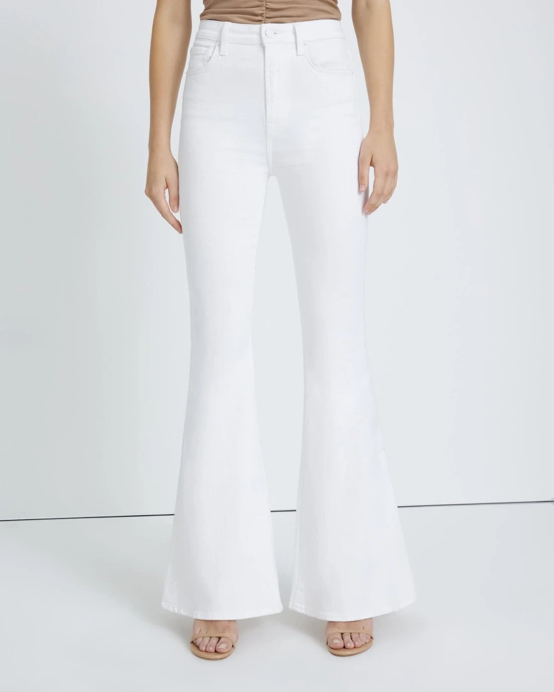 These bright white, ultra high-rise, jeans make an impression. With a 70s-inspired silhouette this pair is fitted through the hips and thighs, and the elongating leg leads to a bold flare. The clean white, medium-stretch denim will be your new all-year-around favorite.